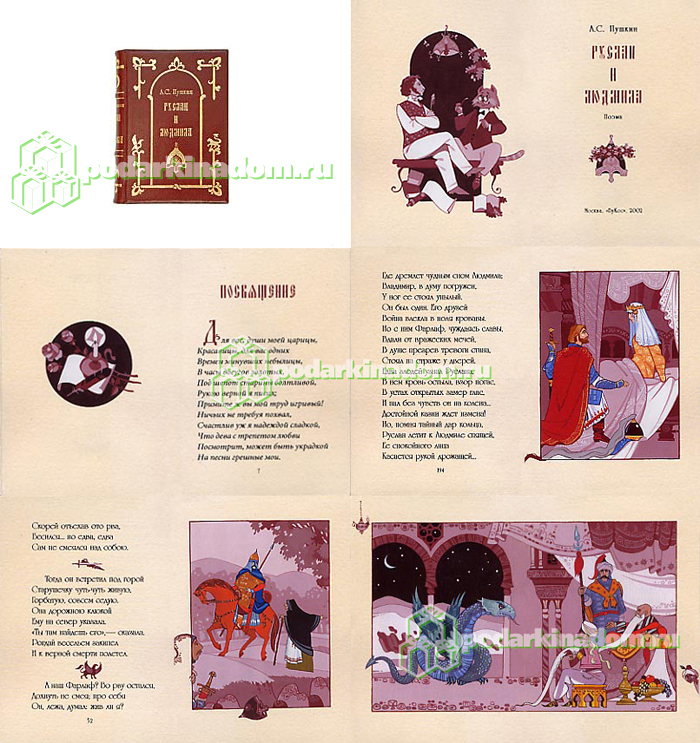 Полная чудес, сокровищ, ярких образов поэма является «волшебным ларцом», который хочется взять в руки, чтобы ощутить его неповторимость, изучить детали, каждый раз находя что-то новое. Именно такой ларец мы постарались создать в нашем новом издании – миниатюрной книге А.С. Пушкина «Руслан и Людмила». Раскрыв бордовый с золотым тиснением томик, вы окунетесь в давно знакомый мир, увидев в нем, однако, много нового, ранее вами не замеченного. В нашем издании нет случайных и непродуманных деталей: основной фон, яркие и вместе с тем выдержанные в общей тональности иллюстрации, слегка витиеватый, но легко читаемый шрифт создают гармоническое целое. Взяв эту книгу в руки, пролистав ее, вы захотите не только изучить ее как произведение полиграфического и переплетного искусства, но еще раз прочитать знакомую поэму, чтобы точнее узнать, где находилось царство Черномора и что за дракон изображен на одной из иллюстраций.