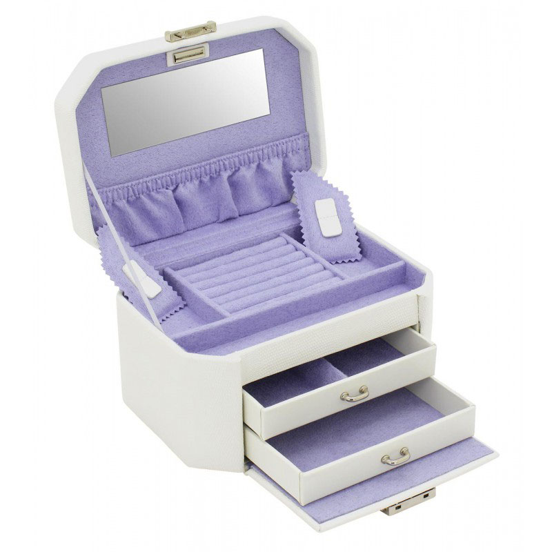 Шкатулка для хранения украшений коллекции Candy от известного немецкого бренда Friedrich Lederwaren выполнена из высококачественной искусственной кожи белого цвета. Внутри отделана мягкой бархатистой на ощупь тканью сиреневого цвета. Внутри шкатулки расположены три просторных секции: два выдвижных ящичка - универсальные, верхнее отделение содержит одну секцию для колец и три универсальных отделения, два из которых оснащены оберегающими подушечками. С внутренней стороны крышки расположен карман для мелких аксессуаров и зеркало. Шкатулка закрывается на надежный замок. Удобная ручка для переноски. При уходе за изделием рекомендуется использовать влажную тряпочку.