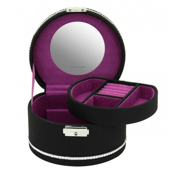 Красивая шкатулка для хранения ювелирных изделий с внешней отделкой из черной ткани.
