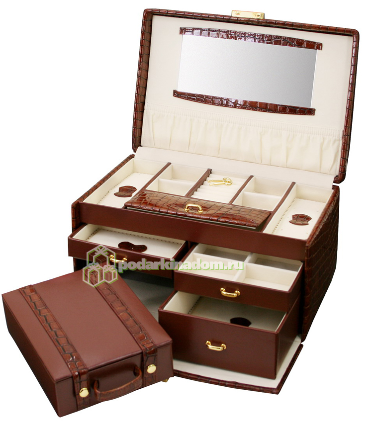 Большая шкатулка для украшений с тремя выдвижными отделениями и дорожным этуи от Champ-Collection, серия Мадрид. Как известно бриллианты – лучшие друзья женщин. А шкатулки от европейского лидера «Champ Collection» - лучший друг бриллиантов и любых достойных украшений. Особенно это становится очевидно перед любым праздником , когда хочется сделать любимой лучший подарок. Стильные, удобные, красивые, эти шкатулки станут лучшим подарком женщине и «оправой» для ее драгоценностей. Представляем Вам лучший подарок - оригинальные шкатулки со множеством ящичков и полочек, которые позволят подобрать индивидуальное место под каждую драгоценность. Шкатулки для украшений - один из самых красивых и в тоже время функциональных подарков для женщин. В этих, казалось бы, безделицах продумана каждая деталь, они стильно и аккуратно оформлены. Шкатулки изготовлены из запатентованных материалов-высококачественной натуральной и искусственной кожи, или других уникальных материалов в большой гамме размеров и расцветок, способных удовлетворить даже самую капризную модницу, ценительницу красоты, комфорта, стиля и оригинальности. Мягкая бархатистая подкладка из флока бережно хранит поверхности Ваших украшений от царапин и потери блеска. Замки, кнопки, прочая фурнитура - полированная латунь, стразы. Топ-модели скрывают внутри себя съемный дорожный футляр - шкатулку в миниатюре. У шкатулок надежные застежки и удобные ручки. Открыв шкатулку, Вы увидите себя в зеркальце. Внутренние отделения снабжены специальными держателями для колец, серег, цепочек и прочих небольших украшений.