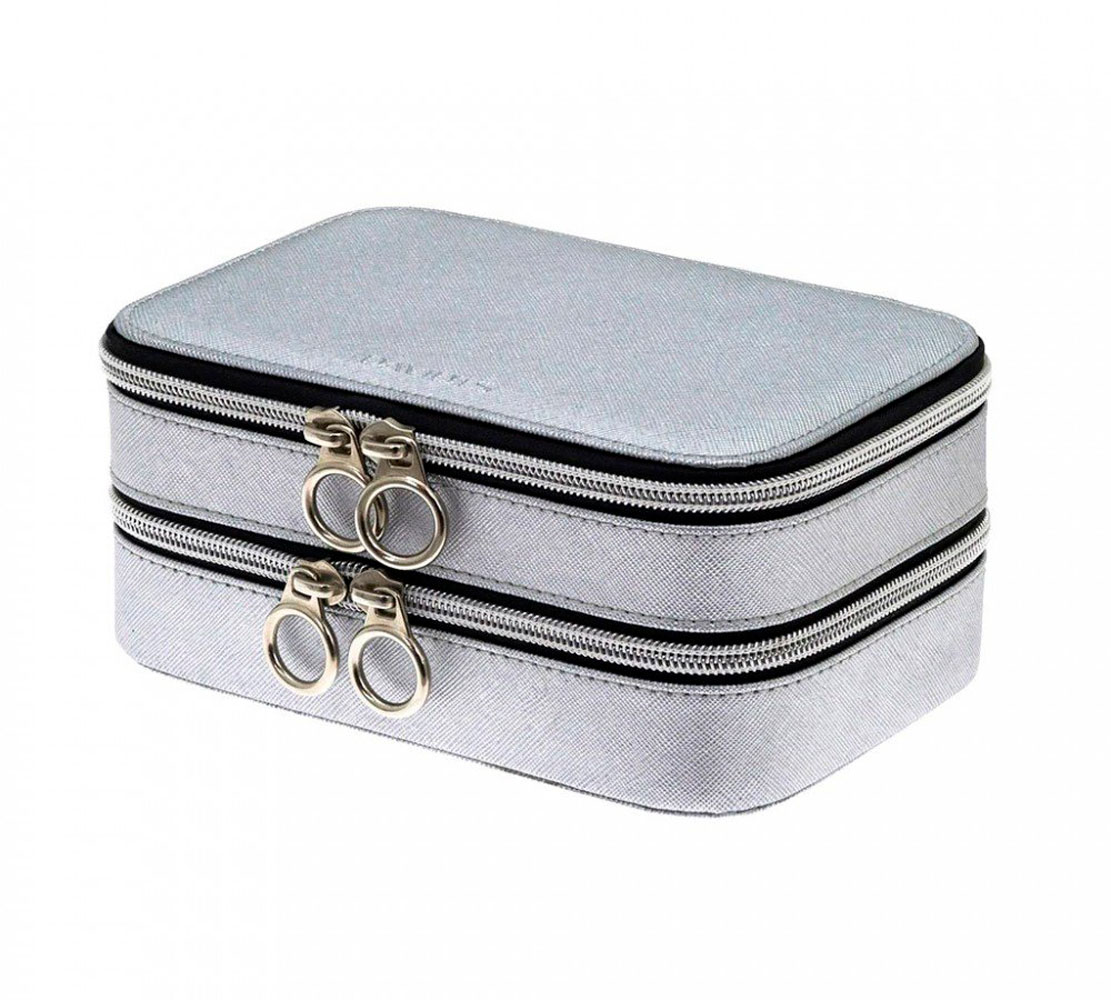 Выполнена из экокожи с линейной фактурой. Внутренняя отделка завершена велюром светло-серого цвета. Верхний ярус футляра состоит из одного большого отделения, трех небольших отделений с перфорированными перегородками для крепления серег, четырех крючков для подвешивания цепочек и одного кармана на резинке. Нижний ярус футляра состоит из четырех средних отделений, одного большого отделения с ювелирными валиками для хранения колец и удобного откидного зеркала. Оба отделения закрываются на молнию.