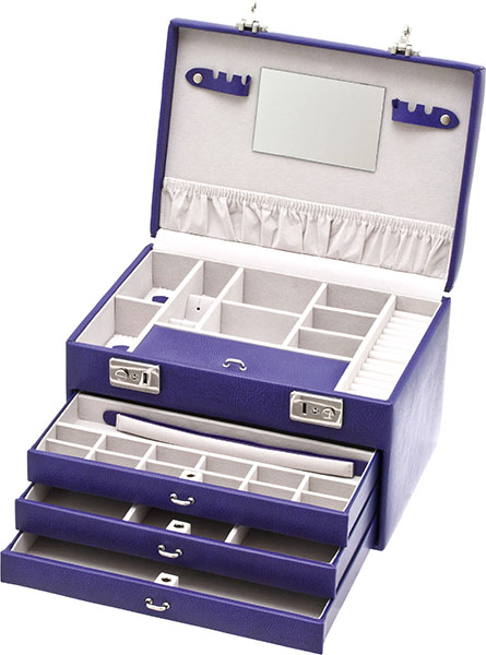 Шкатулка для украшений. Внутри: 3 выдвижных отсека, держатели для колец, отделения для разнообразных украшений и запонок. На верхней крышке зеркало, мягкий карман и крепления для цепочек. Внутенняя отделка - полиэстер. Закрывается на ключ.