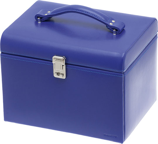 Вместительная и элегантная шкатулка. Внутри имеет: 3 выдвижных отсека, отделения для украшений и держатели для серьг. На верхней крышке размещено зеркало, кармашки для хранения и держатели для серег или цепочек. Внешняя отделка выполнена из натуральной кожи синего цвета. Внутренняя отделка - полиэстер. Закрывается на ключ.