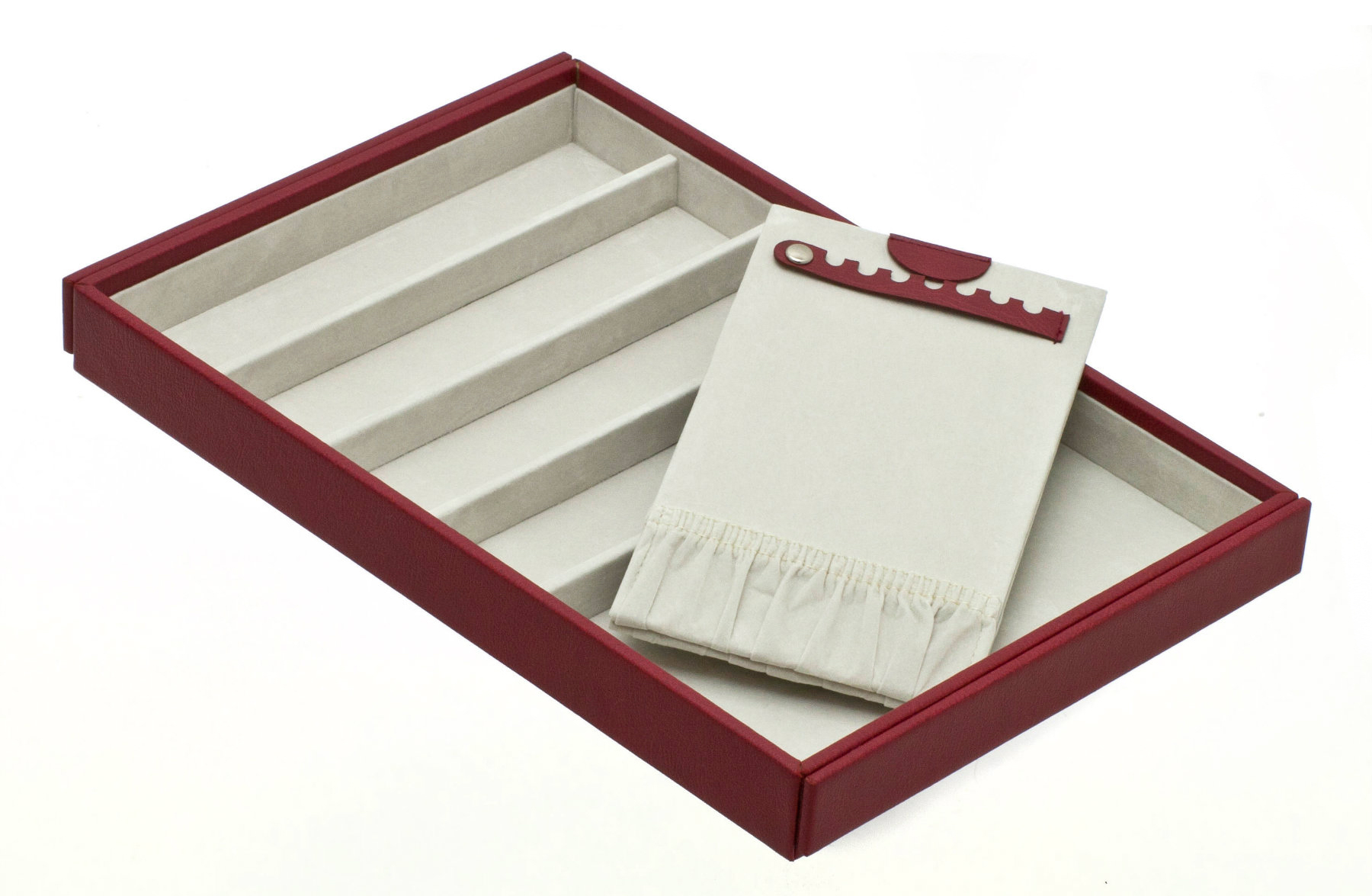 Открытый лоток для хранения украшений выполнен из высококачественной экокожи бордового цвета.