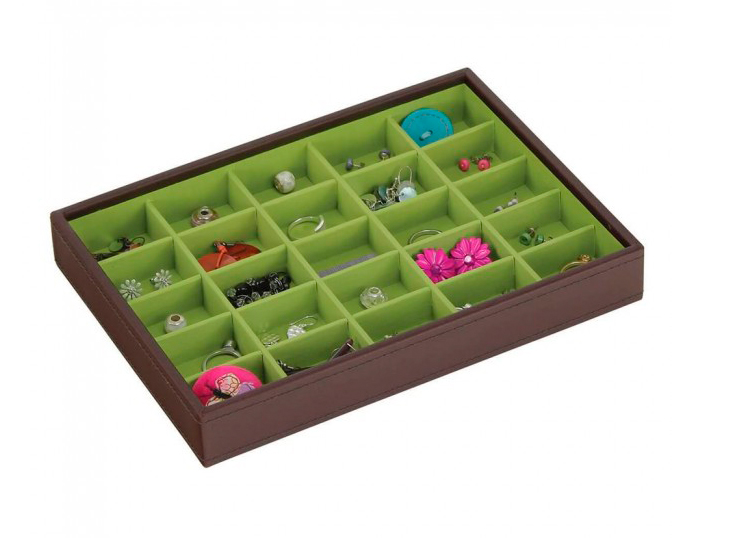 Лоток для хранения украшений Stackers выполнен из высококачественной экокожи коричневого цвета. Внутренняя отделка из хлопковой ткани зеленого цвета.