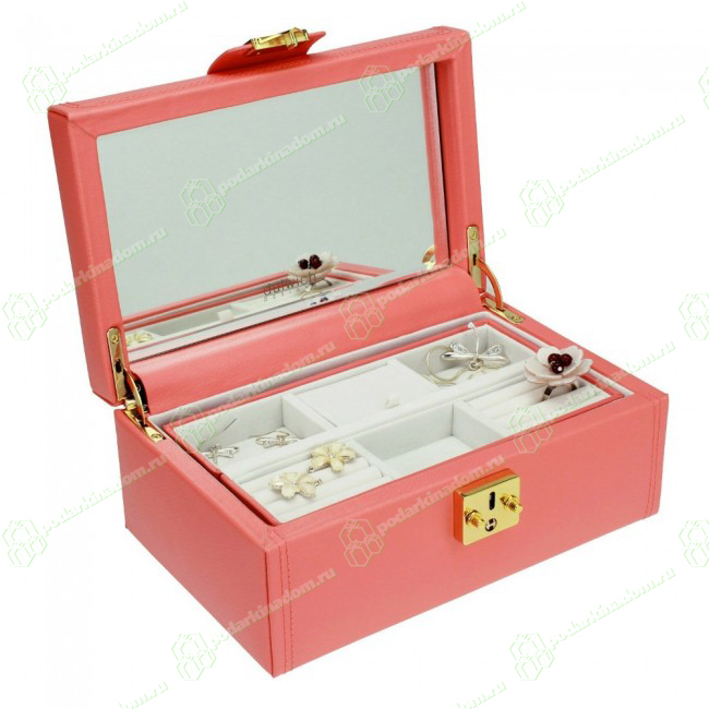 Компактная и очень функциональная шкатулка для украшений с оригинальной отделкой нежно-кораллового цвета из натуральной кожи. Верхнее отделение представляет из себя разложенный футляр, который можно вынуть и взять с собой в поездку. В этуи предусмотрены четыре полых отделения и два отделения с валиками для серег, запонок и колец. Скрытое отделение разделено перегородками на три равные части. Удобное зеркало и запираемый замок.