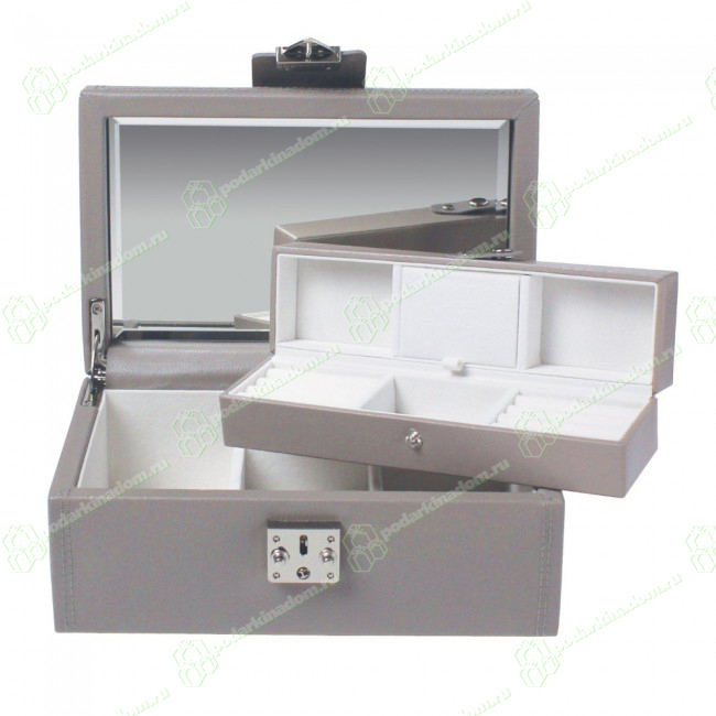 Верхний ярус: четыре полых отделения, два ювелирных валика для хранения колец и серег. А также верхняя полка может служить Вам как дорожный футляр, так как складывается пополам и закрывается на кнопку.