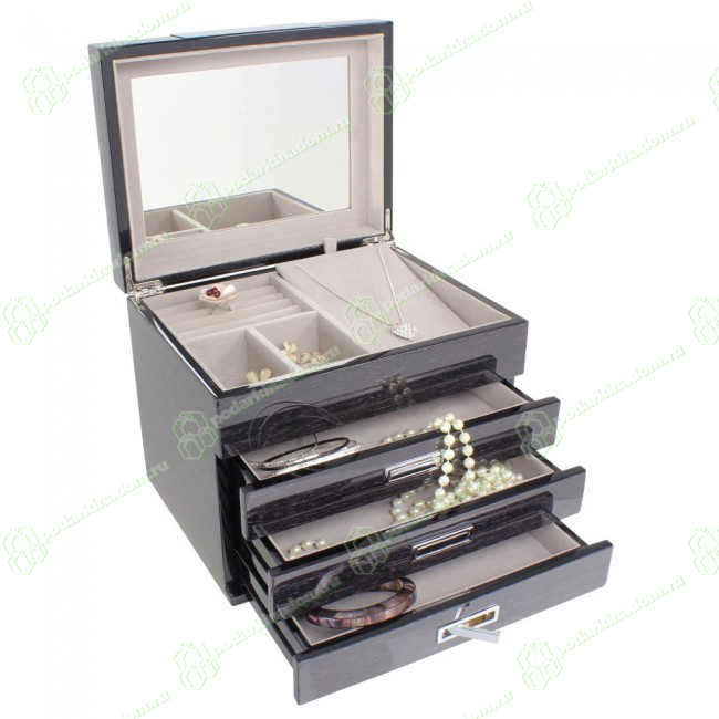 Роскошная шкатулка для драгоценностей с тремя выдвижными ящичками, выполнена из массива дерева с хромированной отделкой.