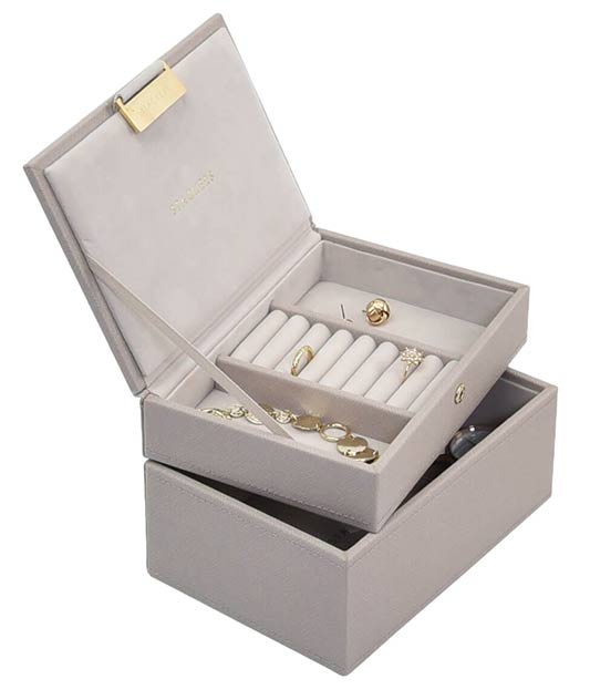 Небольшая двухуровневая шкатулка для украшений из экокожи серо-коричневого цвета с фактурой "перо голубя". Внутренняя отделка из вельвета серого цвета. На верхней полке предусмотрены два средних отделения для драгоценностей и большой ювелирный валик для хранения колец и серег. Нижняя вместительная полка для украшений (глубина 6 см). Верхняя полка шкатулки закрывается на клипсу с логотипом Stackers.