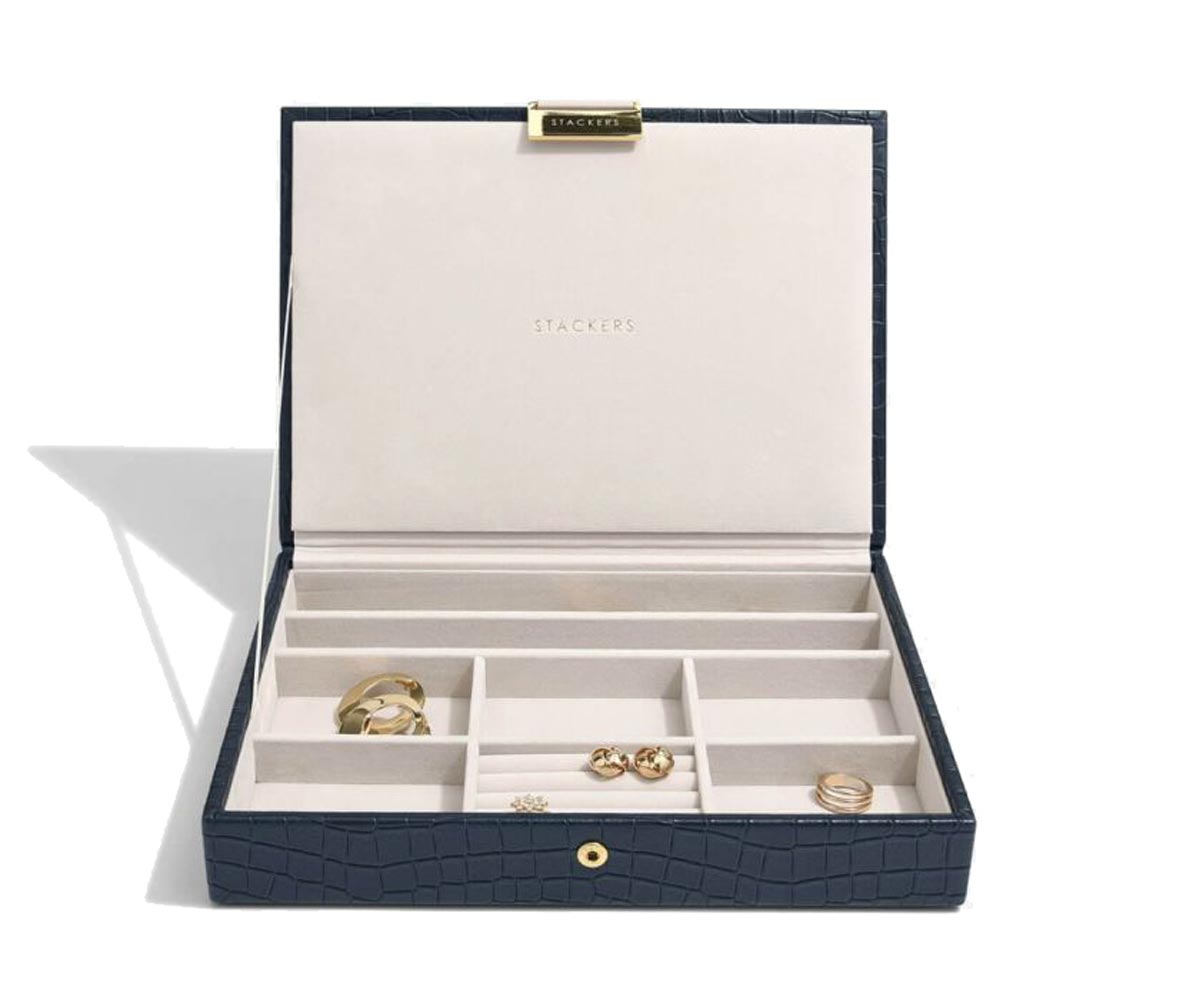Трехуровневая шкатулка для драгоценностей и украшений. Изготовлена из высококачественной экокожи синего цвета с фактурной отделкой под "крокодила". Внутренняя отделка из вельвета светло-серого цвета.