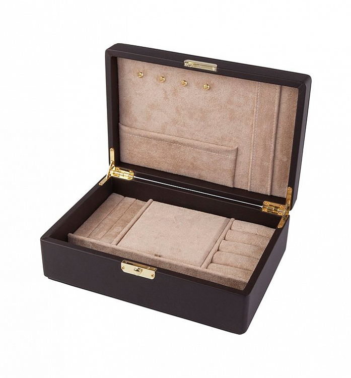 Шкатулка для украшений коричневого цвета выполнена из искусственной кожи.