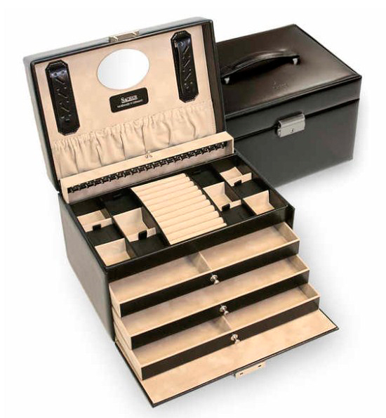 Шкатулка для украшений выполнена из натуральной кожи. Внутри основное отделение с валиками для колец и отсеками для аксессуаров, 3 выдвижных ящика с отделениями для хранения украшений и аксессуаров.