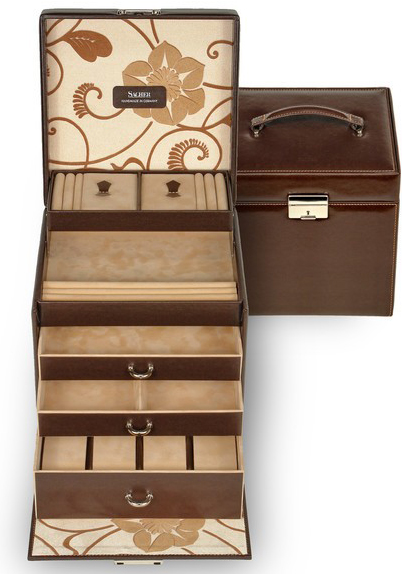 Большая шкатулка, верхний ярус которой автоматически поднимается при открытии шкатулки. Имеет дополнительно три выдвижных ящичка, один из которых глубокий и разделен на два отдела: один под украшения, другой - под часы и браслеты.