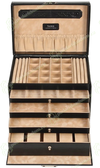 Большая шкатулка с 4-мя выдвижными ящичками, один из которых глубокий и разделен на два отдела: один под украшения, другой под часы и браслеты. Верхний отдел предусмотрен для колец, перстней и сережек.