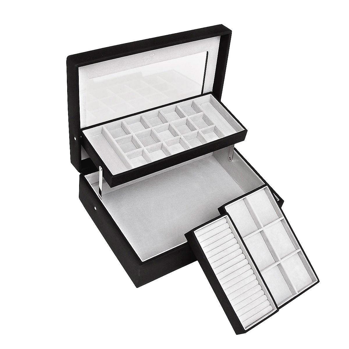 В нижней части большое отделение и два вынимающихся лотка, один с 6 секциями и один с валиками для колец.