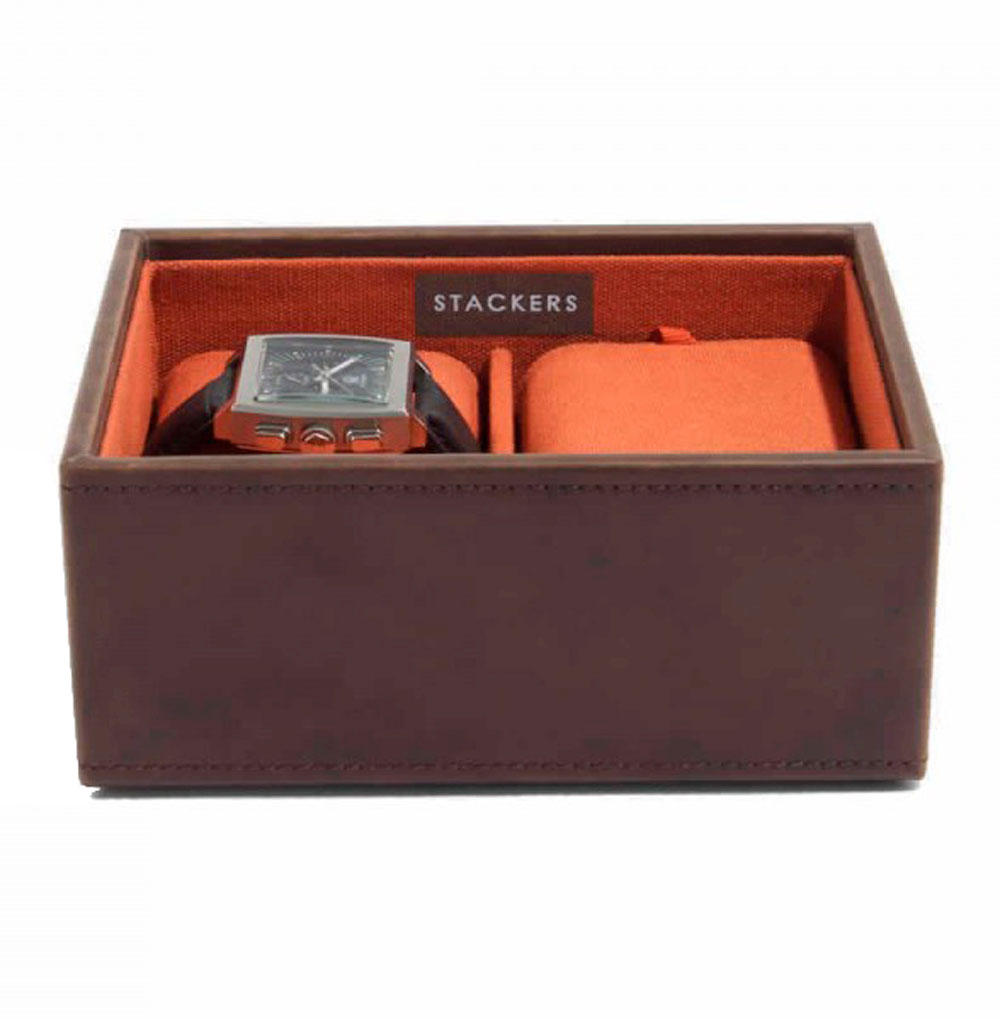 Внутренняя отделка из оранжевого вельвета. Лоток состоит из 2 отделений с подушками для хранения часов.