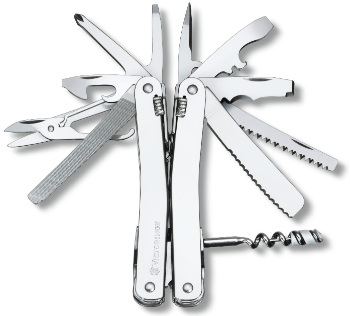 Сам по себе Swiss Tool представляет пассатижи с ручками, выступающими также в роли линеек. На самом же деле – ручки – это своеобразные ножны для: большого лезвия, открывалок, пилы по дереву, напильнику, ножовки по металлу, отверток и многого другого.