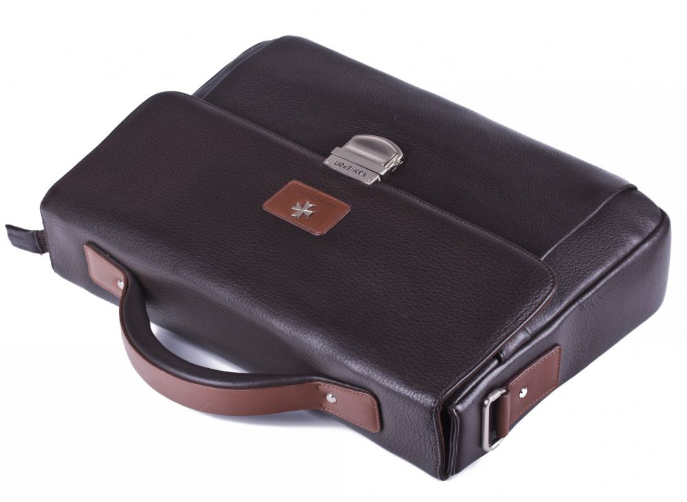 Швейцарский портфель с кодовым замком выполнен из натуральной телячей кожи коричневого цвета.