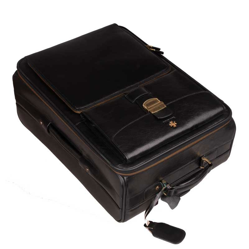 Снаружи: ручка выдвижная (до 50 см), 2 колеса, замок, на лицевой стороне 2 накладных кармана (нижний на молнии для бумаг, верхний на замке с клапаном, в нём карман для сотового, 3 кармашка для визитных/кредитных карт, 2 гнезда для ручек); на тыльной стороне скрытый карман на молнии. Внутри: одно большое отделение с отделением-портпледом под костюм, на задней стенке карман на молнии.