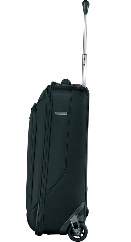 Дорожный чемодан на колесиках выполнен из прочного нейлона черного цвета объемом 44 литра