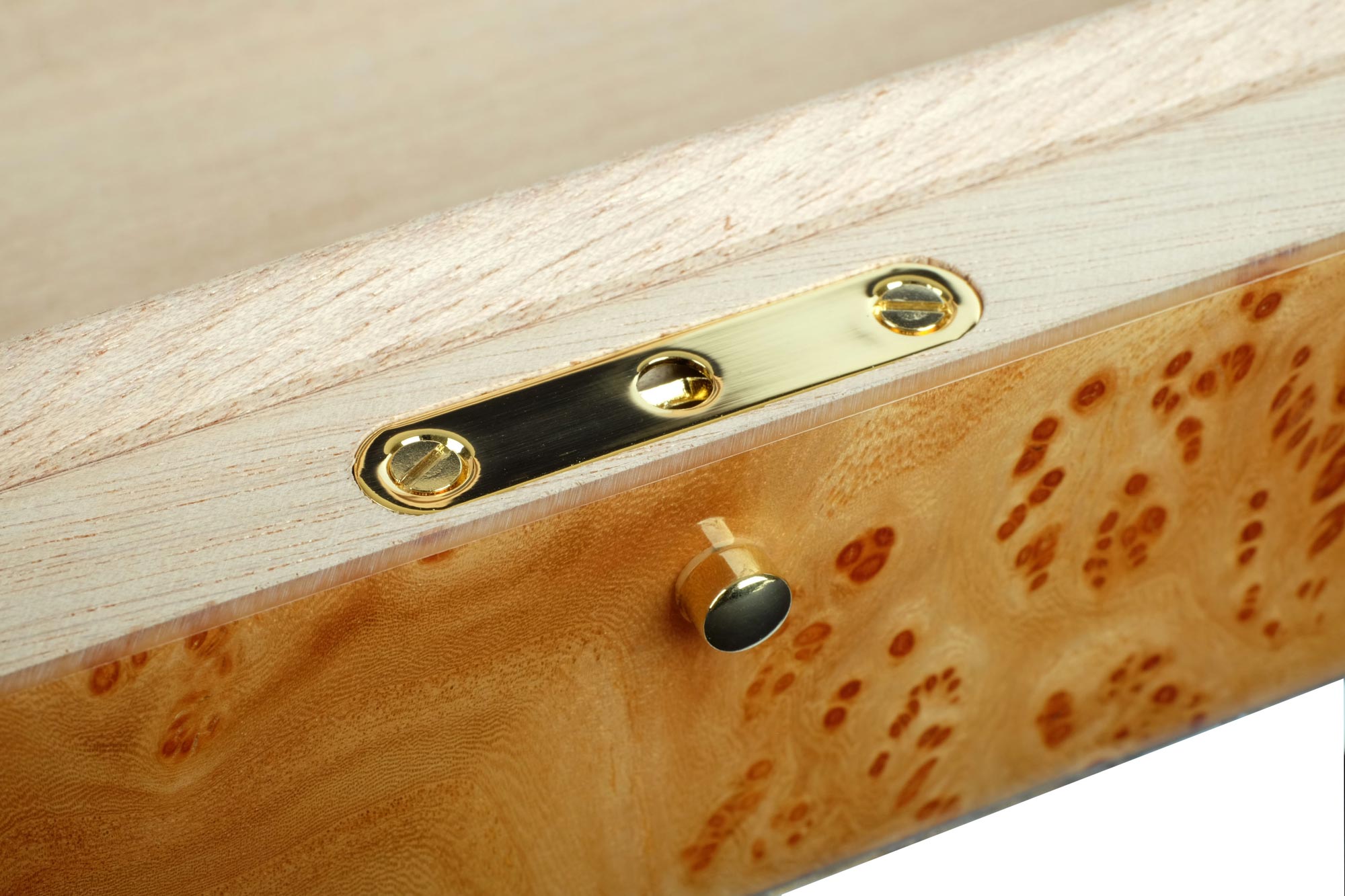 Хьюмидор на 25 сигар лимитированной серии из 100 штук от итальянских мастеров фабрики Fabrizio Gentili SRL. Исполнен в классическом итальянском стиле — элегантное сочетание лучших материалов в единое целое: ценных пород дерева, кожи, металла. Корпус представляет собой комбинацию нескольких видов дерева, что обеспечивает стойкость к деформации при колебаниях температуры и влажности. Внутренняя отделка выполнена из высококачественного испанского кедра. Снаружи — шпон тополя, покрытый 7-ю слоями лака, а также натуральная телячья кожа с тиснением и лакировкой. На внутренней стороне крышки — табличка с порядковым номером изделия в серии из 100 шт. В комплекте с хьюмидором идут увлажнитель с акриловым полимером последнего поколения, высокоточный откалиброванный итальянский гигрометр.