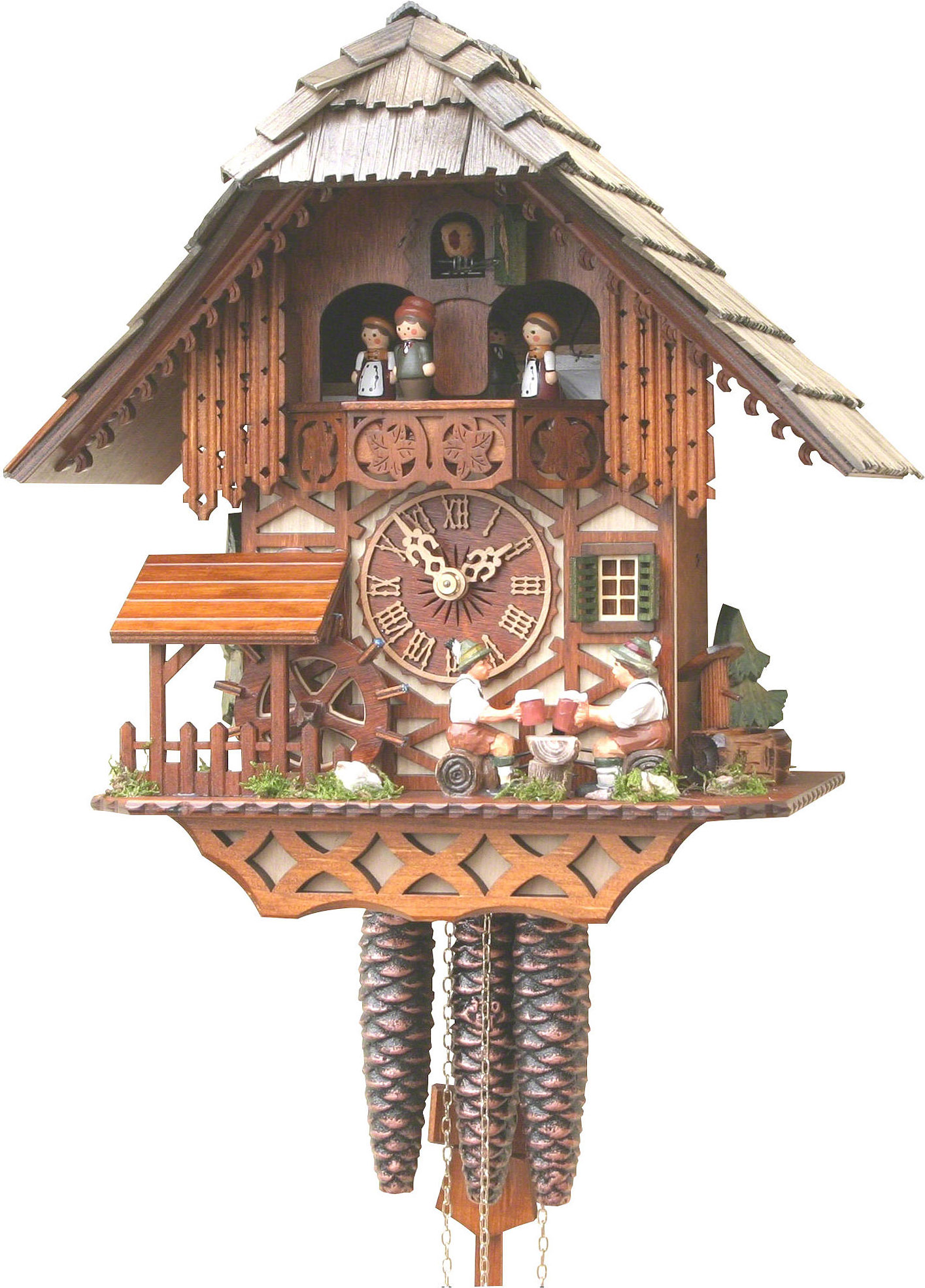 Механические музыкальные часы с кукушкой. Ручная работа. Запас хода — 1 день. Подвижные фигурки танцоров, фигурки пьющих пиво мужчин, ручная роспись, крыша черепица. Колесо мельницы крутится каждый час.