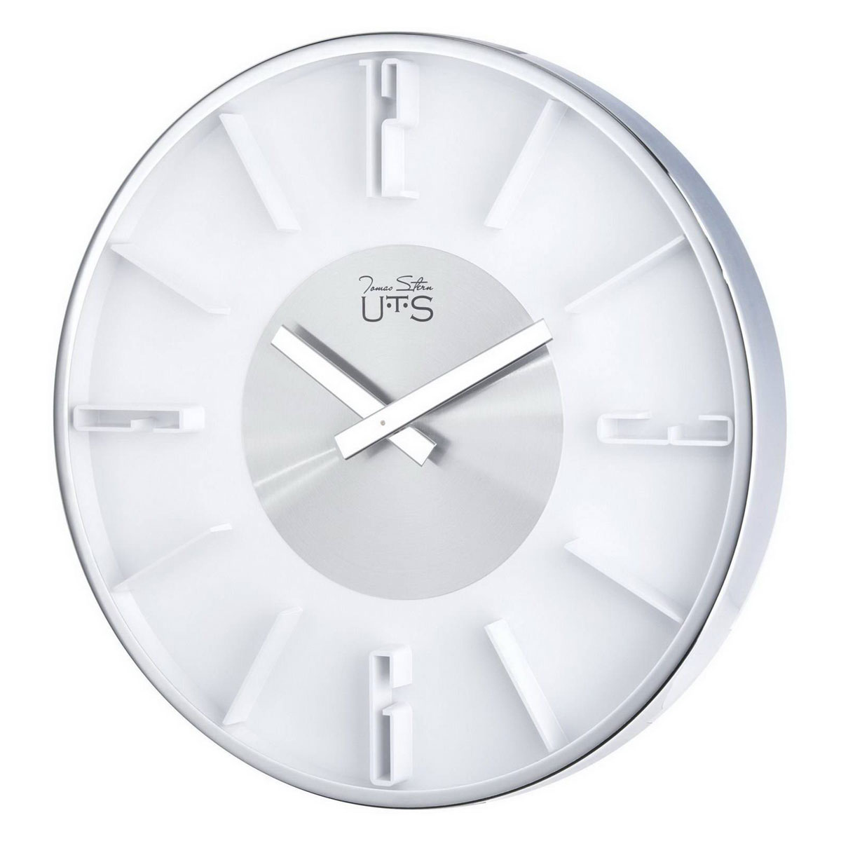 Циферблат с объемными арабскими цифрами и метками из матового пластика белого цвета. Центральный диск выполнен из шлифованного металла. Отделка стрелок - хром. Циферблат закрыт стеклом.