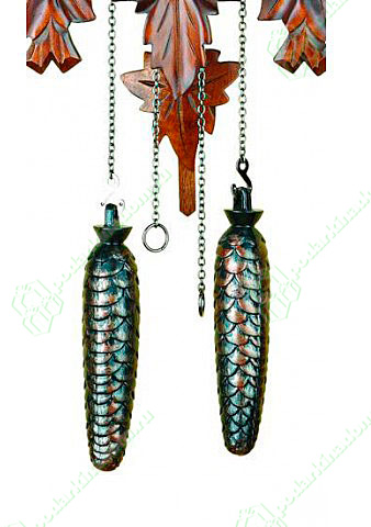 Часы с цепочным подвесом гирь в виде шишек и деревянным маятником.