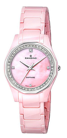 Женские наручные часы розового цвета с перламутровым циферблатом инкрустирован бриллиантами